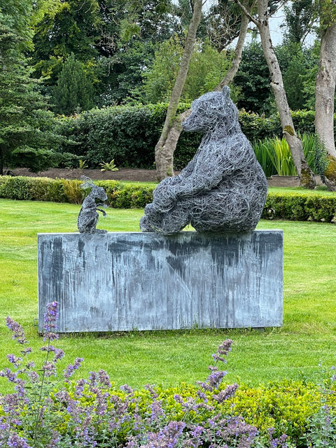 Horse head commissions , Have your pony or horse immortalised in wire for your stable yard . Here is a past example of my old Hunter Tigga whose sculpture is exhibited in the studio garden and at Burghley . For the past 3 years I have used this sculpture for the water feature in the Lake at the Land Rover Experience display at Defender Burghley.