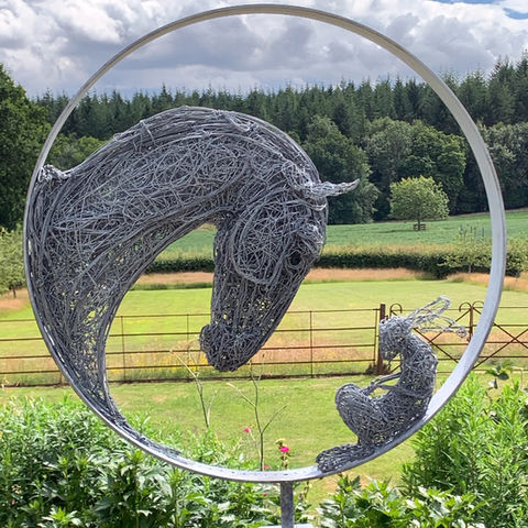 This sculpture was created in 2020 depicting two horse heads to form a heart shape symbol of love drawn and now in a series of paintings by Rupert, too. At 1.8m diameter or 1.5m diameter.
